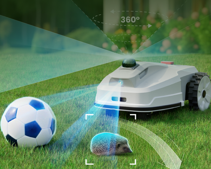 The smart wireless robotic lawn mower ensures safe, automatic mowing with semantic vision, ultrasonic and bumper sensors, lift detection, and an emergency stop—offering full protection from every angle.